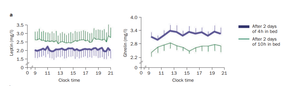 The results from a 2004 study in the Journal of Clinical Endocrinology & Metabolism shows that leptin levels (satiety hormone) decreased and ghrelin (hunger hormone) increased after just two days of reduced sleep.