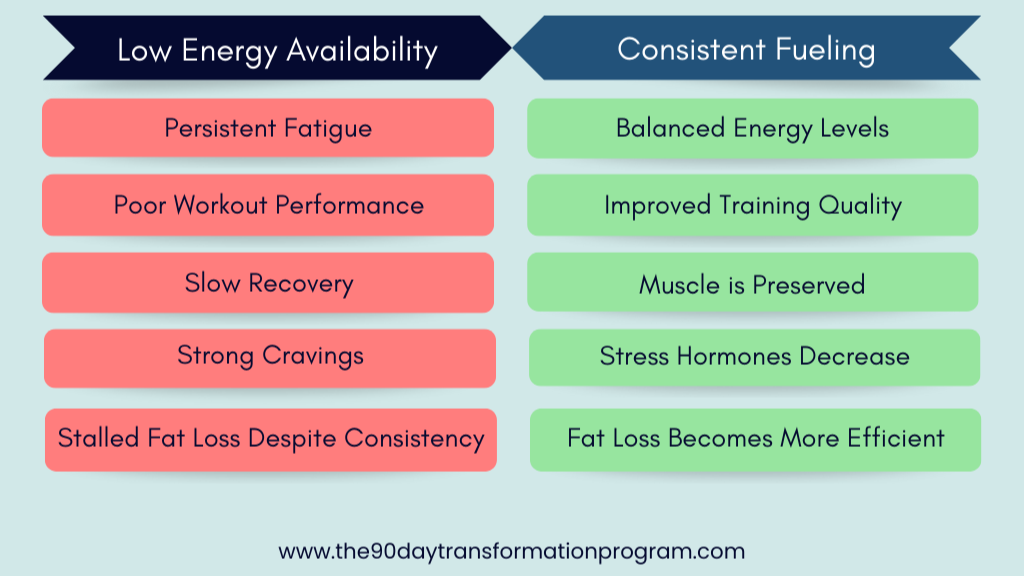 When energy availability is restored and maintained, hormonal regulation improves, training adaptations become more consistent, and fat loss becomes a byproduct of improved metabolic function rather than a constant struggle.