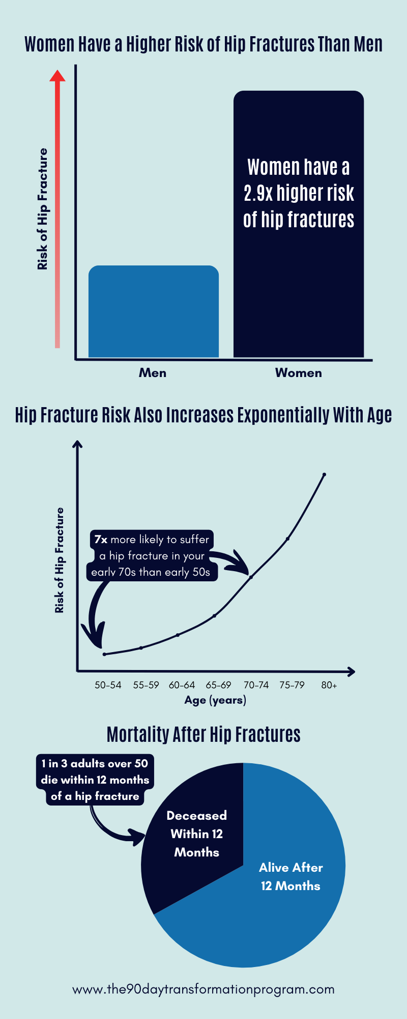 This becomes increasingly important for women approaching perimenopause, when estrogen fluctuations begin affecting bone strength meaning fractures become increasingly likely. E.g. Hip fractures - about 300,000 Americans over 65 fall and break their hips annually.